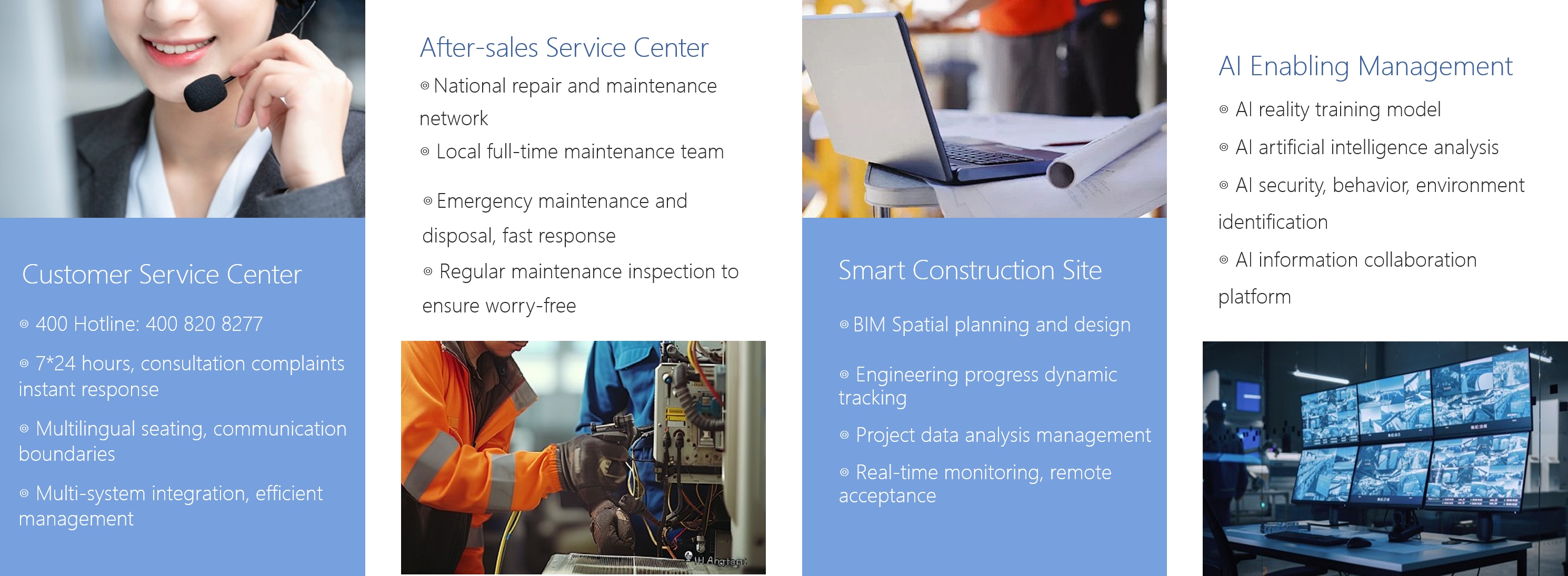 AI-powered intelligent engineering management integrates construction and maintenance system platforms, enabling intuitive data visualization, real-time monitoring, risk alerts, remote scheduling, and instant response. With 24/7 customer service and global maintenance service centers, it establishes an efficient and interactive smart engineering management system, ensuring a safe and controlled construction management process.